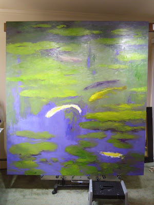 I had a full day and was able to complete my first solid paint layer including starting my Koi. I like to go as far with each Koi as possible - this includes painting the areas around each. Sometimes you only get one chance to make this part work - if I'm not careful everything after reduces the spontaneity so I go back in, prepared to cover good work.
