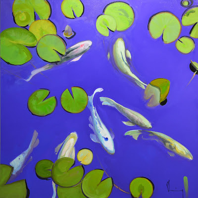 Background is not dry.... Today was interesting, I ended up sinking the Koi deeper into the water, and think it worked well. There was also an additional layer of paint on all the lily pads.